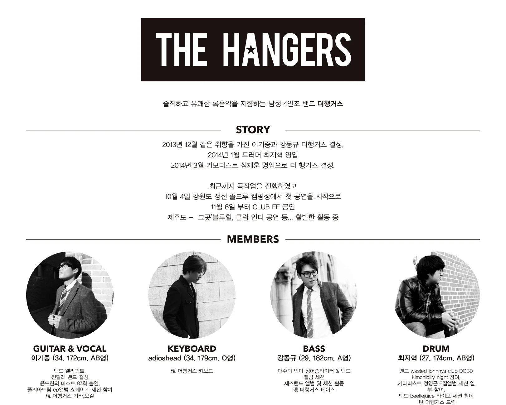 솔직하고 유쾌한 록음악을 지향하는 '더행거스'는 기타와 보컬을 맡고있는 '이기중'과 키보드의 '아디오스헤드', 베이스의 '강동규, 그리고 드럼의 '최지혁'으로 이루어진 남성 4인조 밴드이다. 지금의 모든 맴버가 모여 결성된지는 갓 1년을 넘겼지만 막강 팀웍과 적지 않은 시간동안 닦아온 탄탄한 실력으로 최근 홍대클럽 일대를 차례로 접수하고 있는 신예 아닌 신예들이다. 무대에서 가장 빛나는 그들의 미래를 응원해본다.