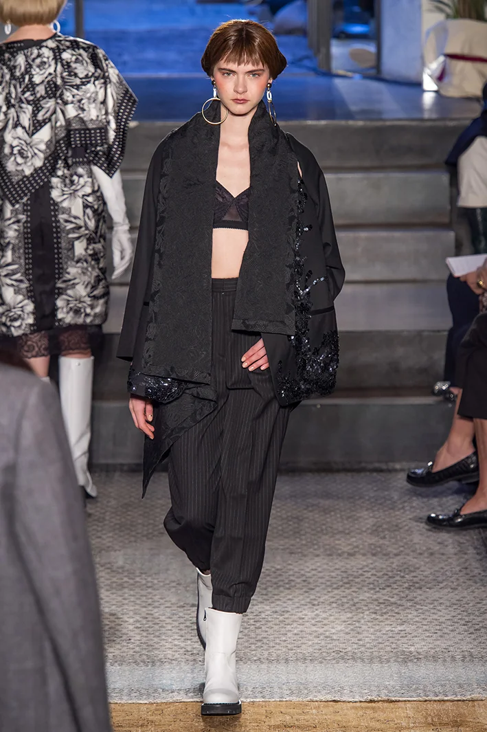 여성복은 빈티지에 덜 의존적이였다. 올리브 드릴 육군 재킷과 라이너의 긴 부분이 자수로 떨어져 나왔으며 강렬하고 다양했다. 레이스, 자수, 크리스탈, 얇은 명주 그물이 불규칙적으로 배열되어 강렬하게 매력적으로 부각되었다. 우리는 마라스의 멋진 south-of-town 가게 옆의 스튜디오 공간에 와 있었고, 모델들은 상점에서 내려와 스튜디오를 돌아 다니며 서로를 스쳐지나갔다. 배우들 중 한 무리는 쇼가 진행됨에 따라 점점 더 드라마틱 한 음색으로 모딜리 아니의 ‘편지'를 읽어내려갔다. 그의 사르데냐에 휩싸인 흥미로운 보헤미안 신화의 개념에서 나오는 컬렉션은 그만큼 관람할 가치가 있다!